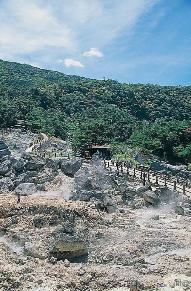 口口在雲仙溫泉地區,分散在著30多家熱泉,蒸氣從因硫黃熏染而變成紅色或黃色的地面噴出,呈現出一片奇特的景色。另外,在雲仙地區最著名的就是大叫喚地獄。攝氏100多度的熱泉奔騰不息,遊人看到如此壯觀的景色,就忍不住大聲叫喚:"好棒呀。"這就是"大叫喚地獄"名字的由來。